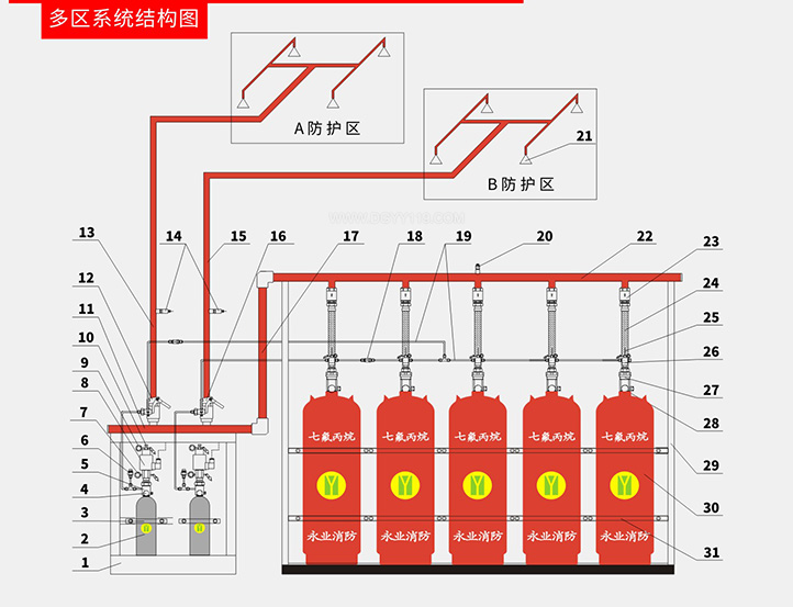有管網七氟丙烷滅火系統(tǒng):就是氣體滅火劑儲存瓶平時放置在專用鋼瓶間內,通過管網連接,在火災發(fā)生時,將滅火劑由鋼瓶間,輸送到需要滅火的防護區(qū)內,通過噴頭進行噴放滅火。